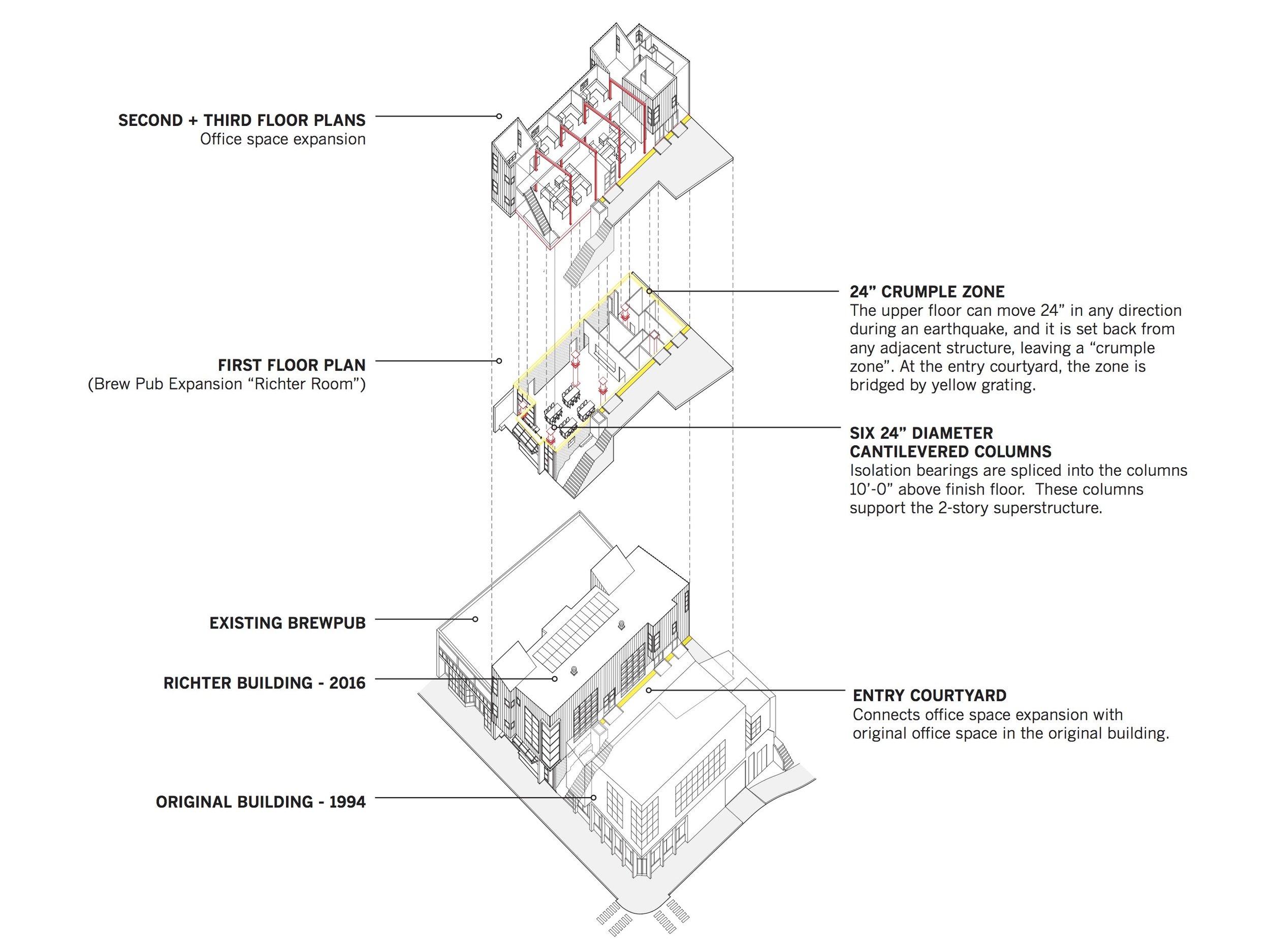 The Tipping Addition is the architectural sibling of the adjacent Tipping Building in Downtown Berkeley. There is a distinct family resemblance between the two structures, as both were designed collaboratively between Fernau and Hartman Architects and Tipping Structural Engineers. Commissioned as a response to Tipping’s growing firm, the building adds approximately 25 new workspaces on the upper two floors. The office space “floats” on six base-isolation columns, which allow the upper floors to move 24” in each direction during a major earthquake. The base-isolators are expressed in a restaurant-brewery space at ground level, where patrons sip their beer among the massive steel columns.